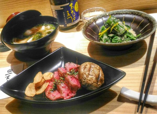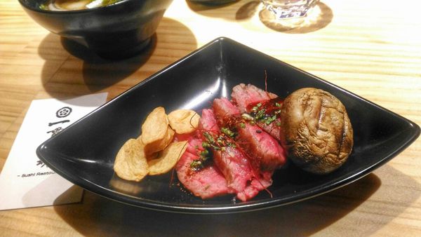 終於來到壓軸!炙燒牛肉,採熟成牛肉,約5.6分熟!牛肉本體軟嫩好入口,搭配蘇香的蒜片,味覺口感更加出色!