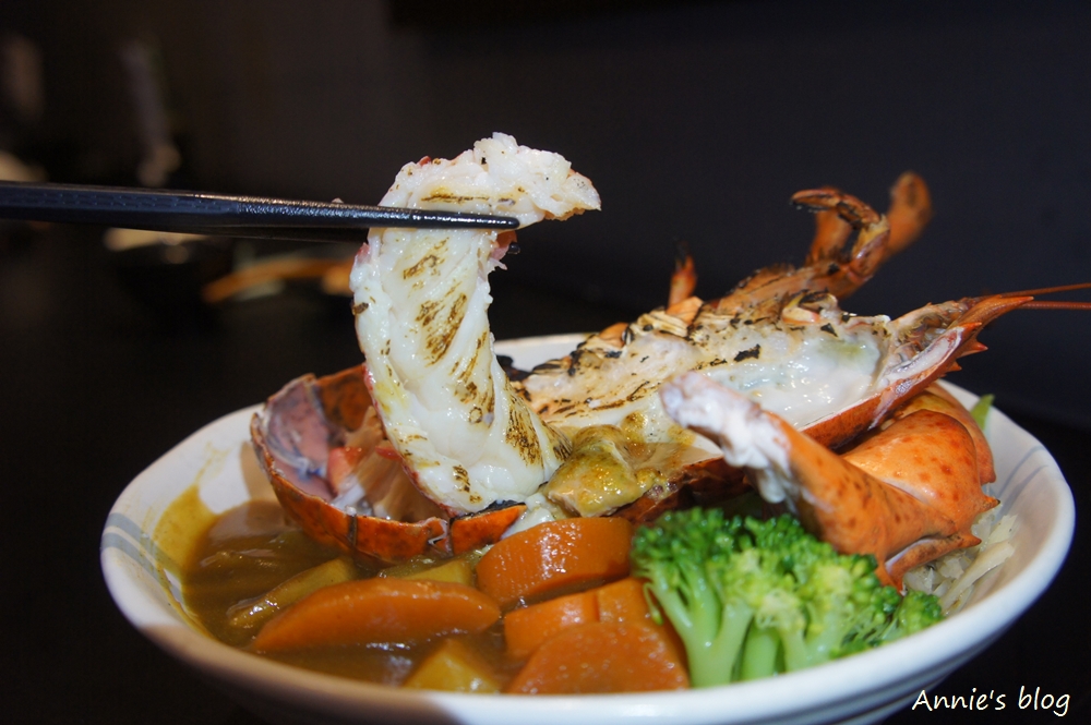 丼飯裡有龍蝦,這還是我第一次品嘗到,剛剛還在水族館裡的龍蝦現點現烤,龍蝦肉炙燒的焦度好迷人啊,整碗丼飯裡除了有半隻龍蝦外,還有花椰菜、牛蒡、玉米筍以及溏心蛋,讓我覺得特別的是丼飯裡是咖哩飯,濃郁的咖哩醬裡有滿滿的胡蘿蔔與馬鈴薯,配色好看之外內容也相當澎湃。