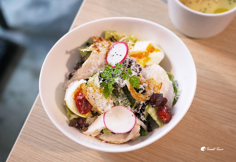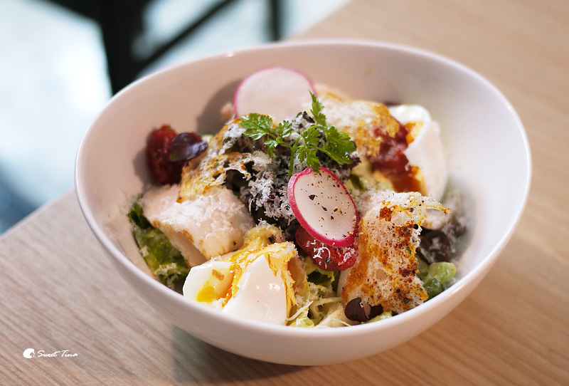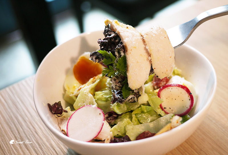 沙拉裡加上些許的蕃茄乾,讓整個味道更加提升了,很喜歡他們整體的搭配,多樣化的食材組合,不愛單吃生菜的朋友,一定要來品嚐他們這道碳烤雞胸凱撒沙拉附溏心蛋,吃起來一點也不無聊還很享受呢。