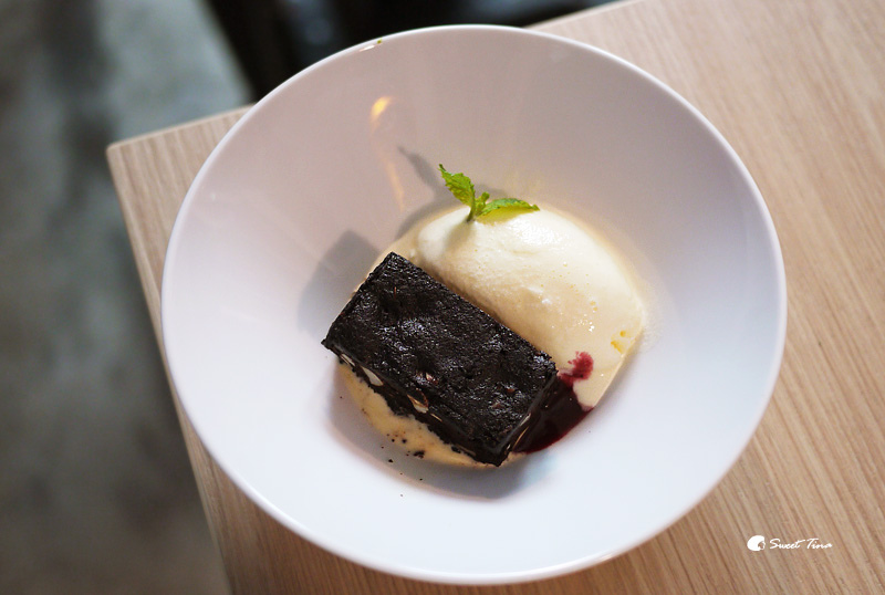 巧克力布朗尼附冰淇淋(晚餐) - 巧克力布朗尼、莓果醬、香草冰淇淋。