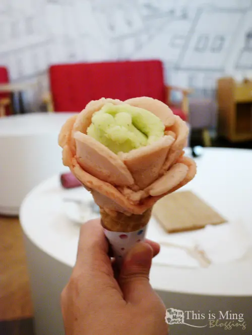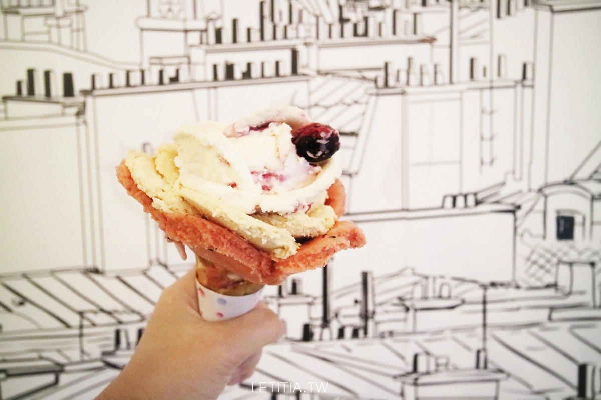 我挑了「糖漬櫻桃」、「焦糖花生」以及「綜合水果」三種口味組成一隻玫瑰甜筒冰淇淋。