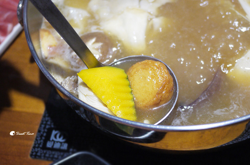 大釧鍋物提供了二人、三人為主的套餐選擇,也有單點的食材可以搭配,而湯頭的部份有蔬菜高湯、豬骨海鮮高湯、生薑味噌高湯、咖哩高湯四種可以選擇,這天我們選擇的是豬骨海鮮高湯 - 以蔬菜高湯為基底,融入豬骨與鰹魚、鯖魚、沙丁魚,再以辣椒、生薑、大蒜、 砂糖提味,口感上非常香濃,和一般火鍋店的湯頭口感真的很不同,是用心熬出的美味口感呢,之後再加湯還是同樣的湯頭,非一般清湯喔。