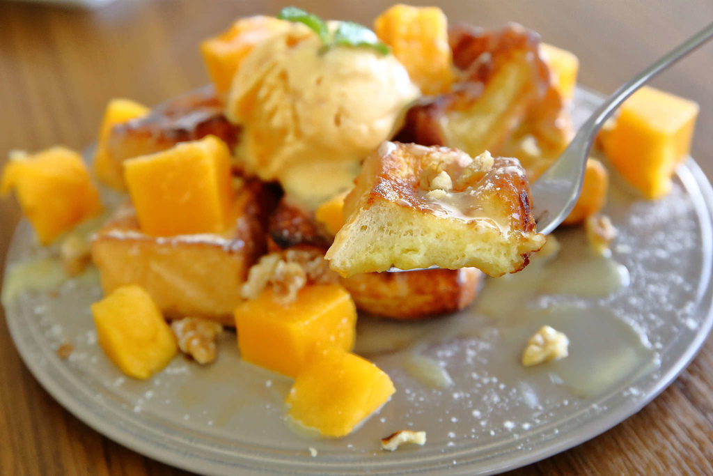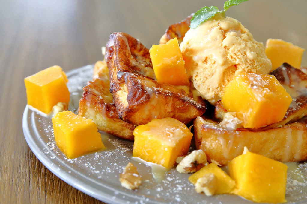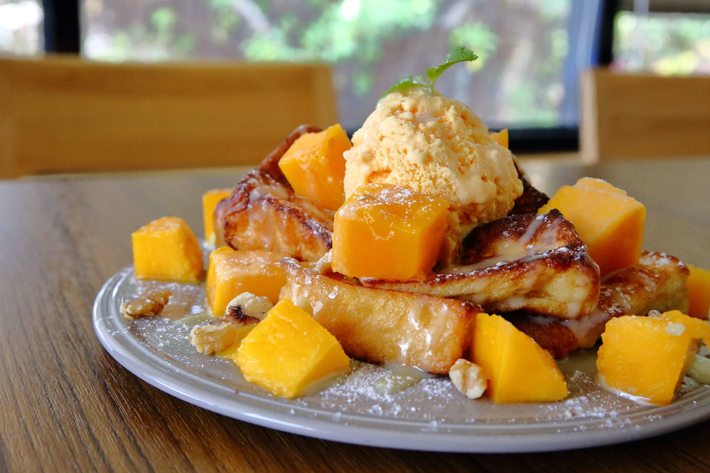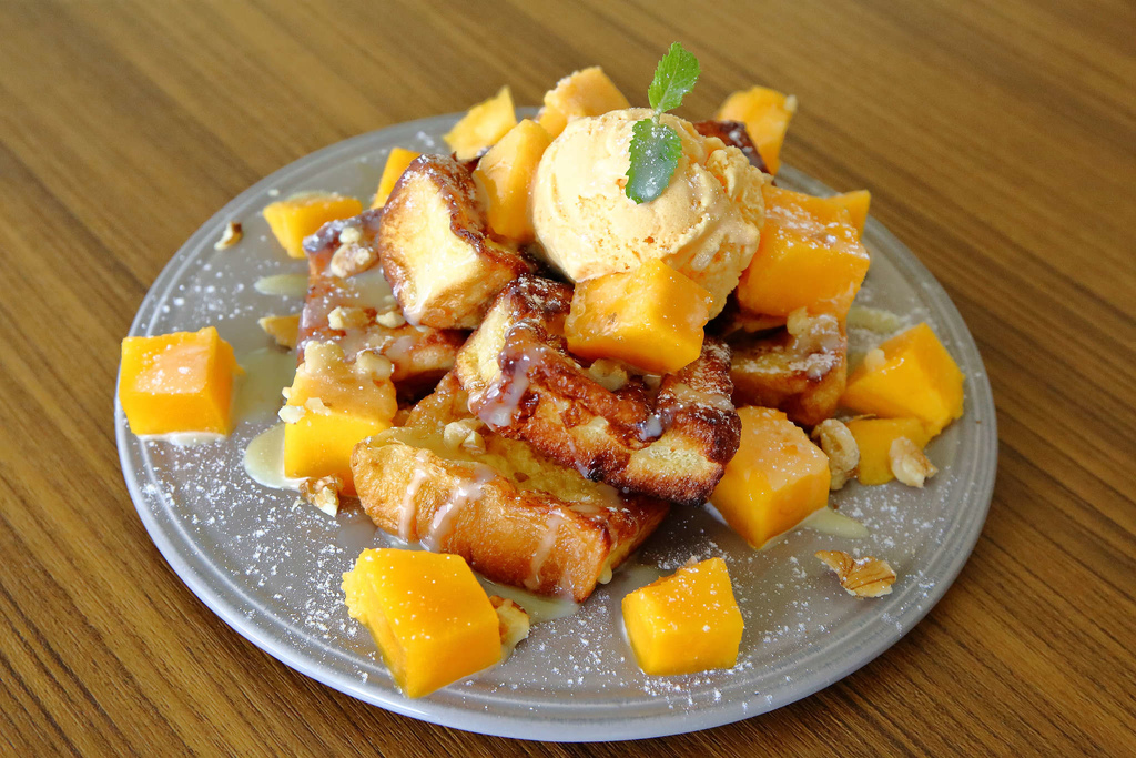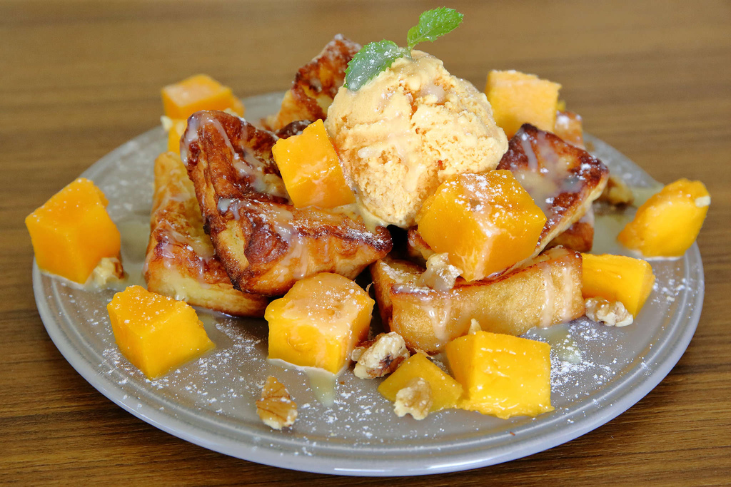 法國吐司,飽滿金黃不焦黑,淋上芒果醬以及鮮芒果、芒果冰淇淋裝飾