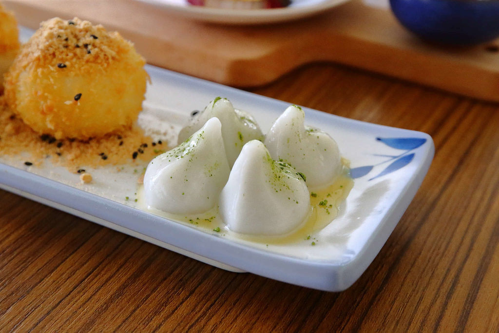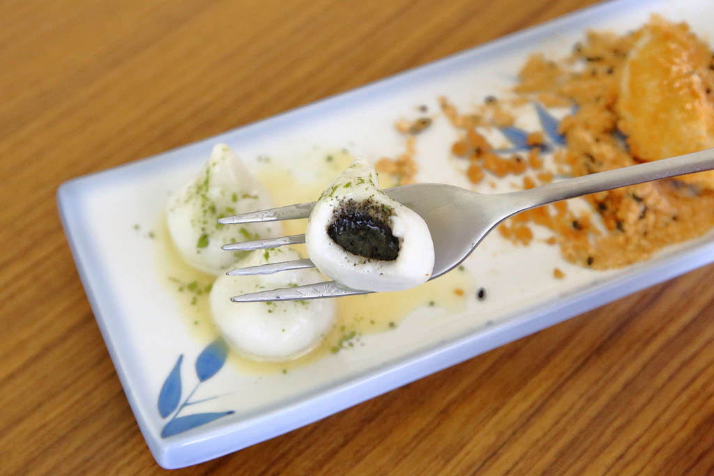 旁邊陪襯的,是外面吃不到的"包餡小湯圓",淋上煉乳,最後再灑上日本森半抹茶粉