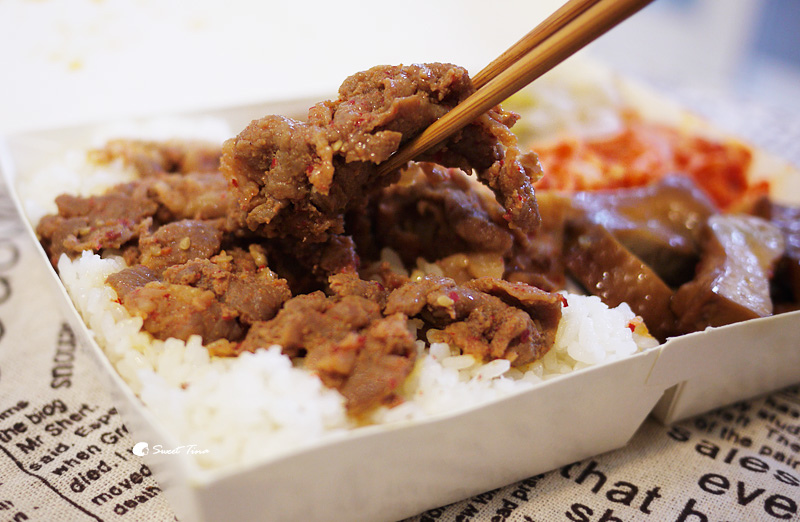 韓式燒肉飯裡有燒肉、一顆滷蛋、豆芽菜、韓式泡菜、豆干,份量十足,絕對是可以飽餐一頓的餐盒呢。