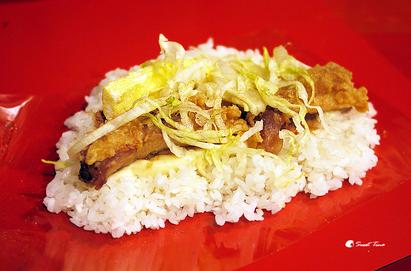 德式香腸飯捲裡頭有德式香腸、玉米、水煮蛋、蔬菜,口感是這三款裡最清爽的,利用清爽的配料讓較搶味的德式香腸突顯出香氣,還不錯的搭配。