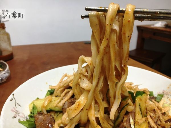 麵條偏粗,口感有嚼勁又Q彈,同樣帶點辣度的醬料伴在其中,加上大量小黃瓜的清脆感,讓整碗麵的口感有層次,大口吃麵很過癮。不過醬料和涼拌豆干是一樣味道,所以味道算有點辣喔,怕辣的塔塔還是要邊吃邊喝水呀。