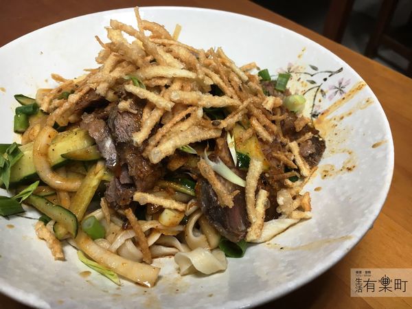 由於天氣有點熱,所以另一碗麵就點了牛肉涼拌麵來試試。牛肉涼拌麵除了加入了小黃瓜、洋蔥與蔥來提味,上頭也灑上了些許的饊子。