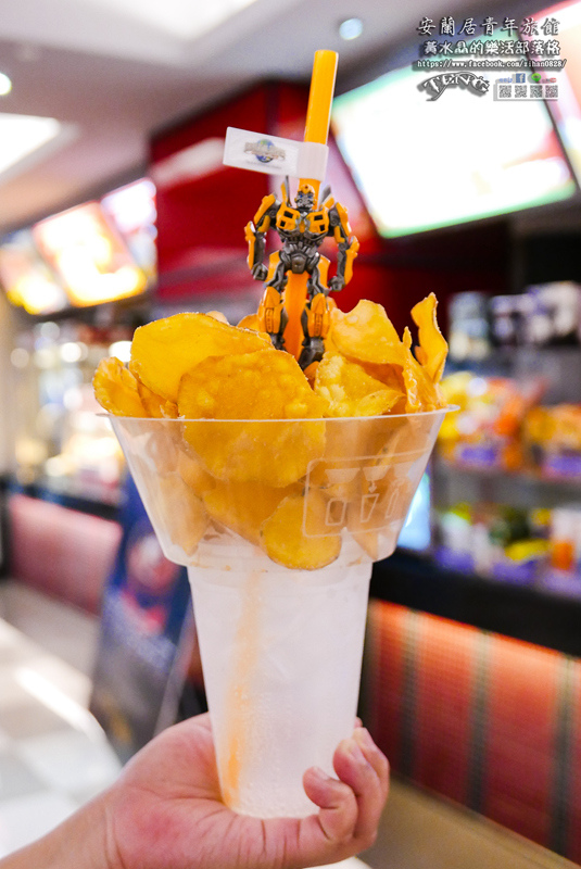 嘿嘿!這杯子很特別吧!下面是飲料上面可以放薯片,雖然2年前在韓國的樂天樂園就看過類似的設計,但是台灣一直沒有引進,而且重點中的重點,這隻變型金鋼的吸管才是真正的“賣點”,花了水晶二張孫中山耶!但是水晶對這種小物實在無力招架。