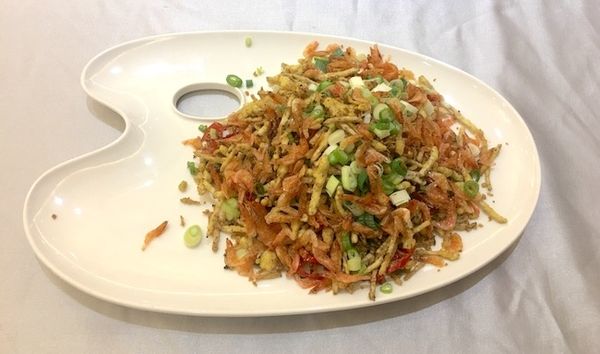 要將芋頭削成絲這完全是刀功地展現,將芋絲及櫻花蝦炸到酥脆而且完全吃不到油,這更要看功伕,夾一口酥脆的芋絲及櫻花蝦入口,芋香與櫻花蝦特有的鮮味充滿嘴中,口感十足,非常好吃,組成美味香酥好料理。