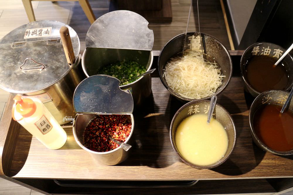 自助醬料區,這天我們幾乎都吃原味沒有拿醬料,但店家的特製醬油很厲害,拿個小碗裝一些再裝點薑絲,等會教大家怎麼吃,嘿嘿!