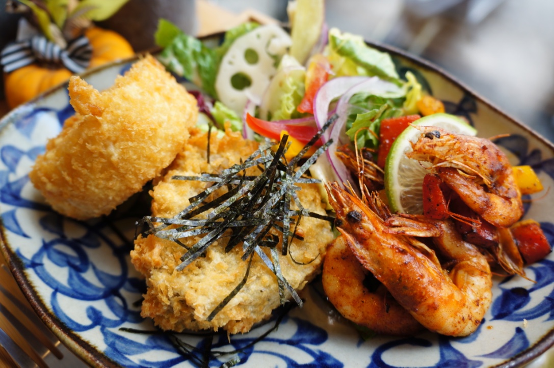炸飯糰套餐的模樣和我心中想得完全不一樣。不知道是哪裡的特色?帶點脆口的炸飯糰,配上旁邊的香料蝦,適合一早就想吃豐盛的朋友。