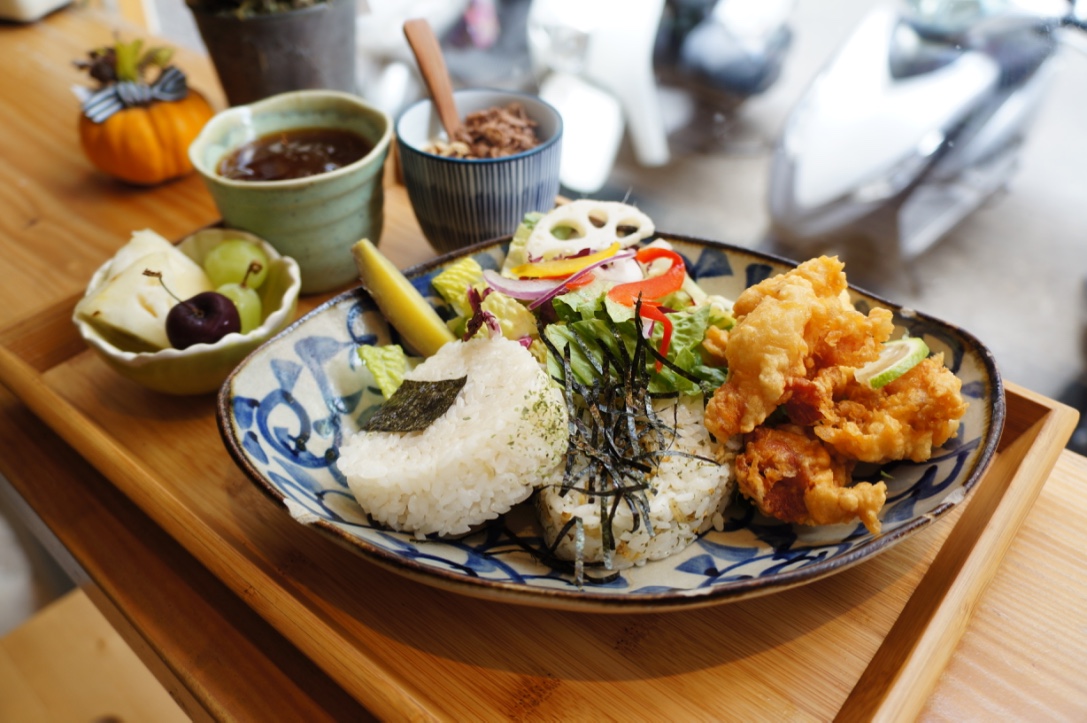 這次一共4個朋友前往,點了4份不同的早餐套餐:日安紐約、飯糰唐揚雞、飯糰海老、手作鹹派,附上飲品、自製優格、新鮮水果。