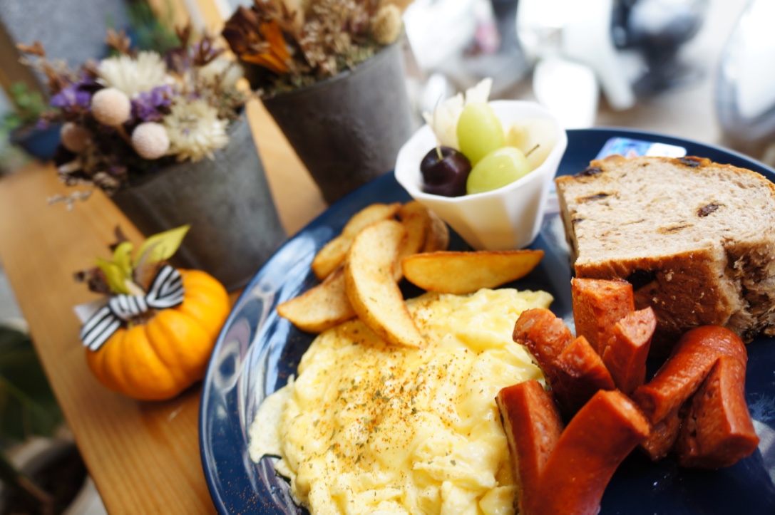 這是一般印象中的日式洋食早餐,簡單的歐式麵包再抹上一口奶油,豐盛的煙燻肉腸跟炒蛋,很舒服的一盤早餐。