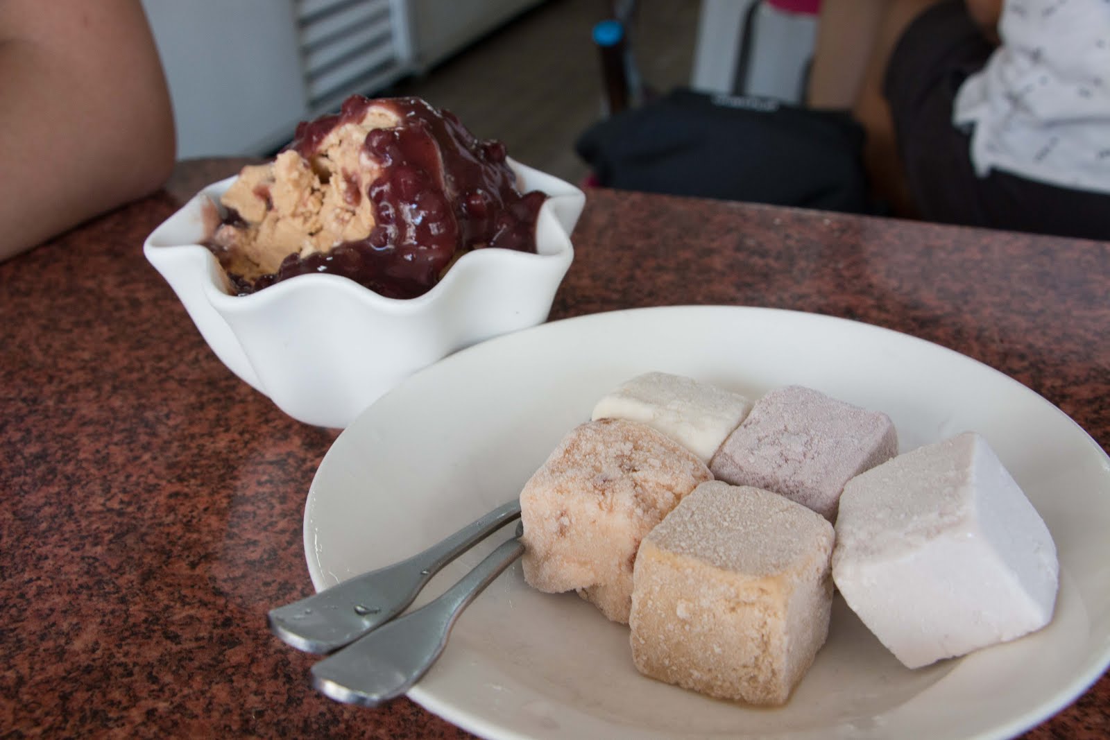 草湖芋仔冰口味由上排左至右分別為牛乳、紅豆、芋頭、酸梅、花生。剛送上來的時候磚狀的草湖芋仔冰十分的硬,叉子幾乎是插不下去的,要硬切小塊或等他稍融一點才剷得起來,味道相當濃郁,跟旁邊的花生霜比起來會稍甜一些,但因為他真的很冰硬,所以其實也不會覺得太甜,尤其個人非常愛酸梅跟花生兩種口味,花生磚的香濃比花生霜硬生生多了一倍。