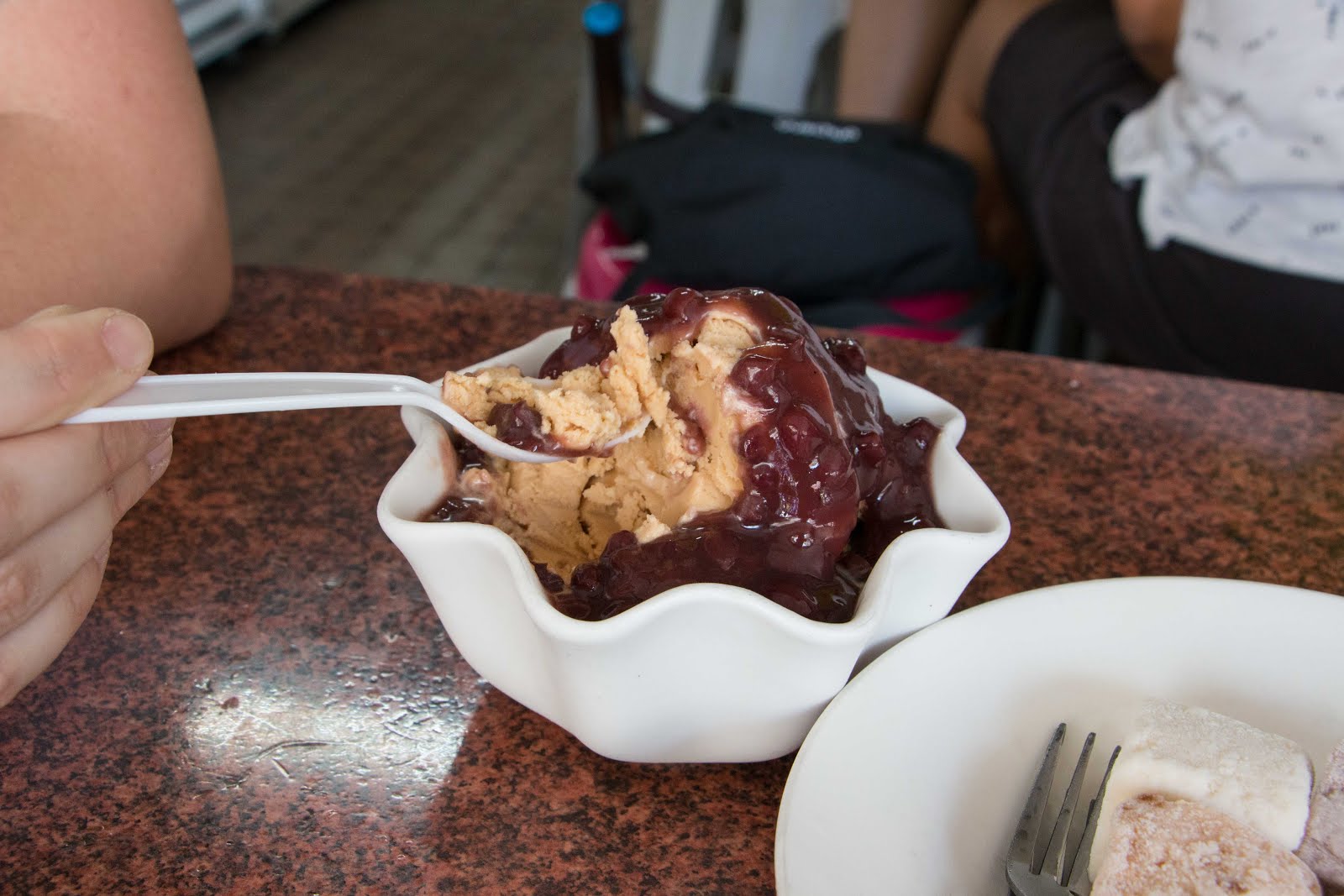 紅豆花生霜為花生霜蓋上一層厚厚的蜜紅豆,花生味道香濃,不會太過甜膩,跟綿密帶有糖香的蜜紅豆很搭。紅豆牛乳霜為牛乳霜加蜜紅豆外,還會額外淋上一層煉乳,之前吃過一次,個人口味覺得太過甜膩,所以這次就嘗試了賣向看起來比較平凡的草湖芋仔冰。