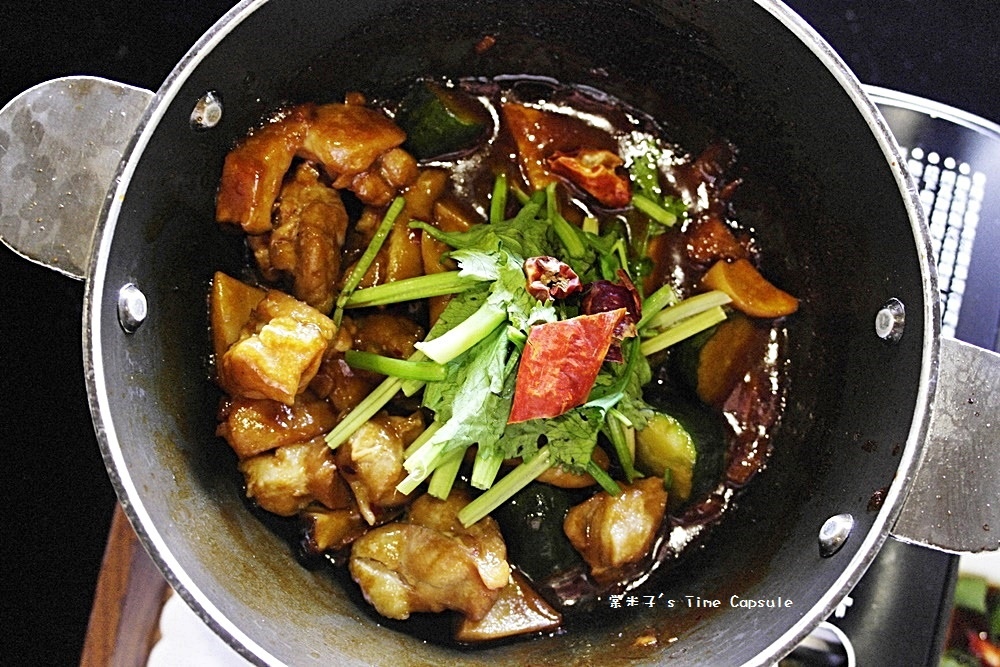 黑色鐵鍋中巴著深色的醬汁的花雕雞油亮亮的色澤超級吸引人,