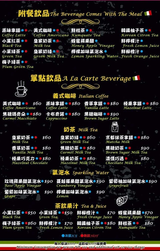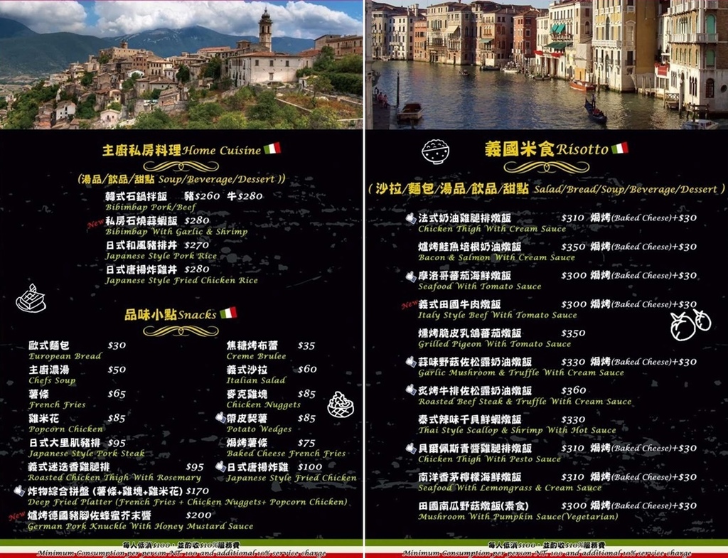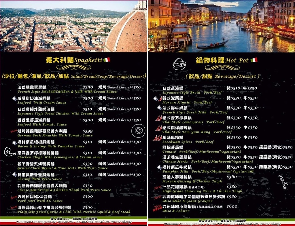 店裡菜單內容以主廚私房料理、義國米食、義大利麵、鍋物料理為主,
