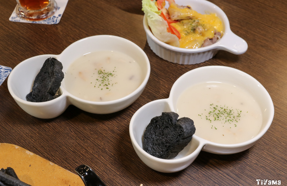 香濃招牌濃湯沾著烤至小酥脆的竹炭麵包,好喝又暖胃