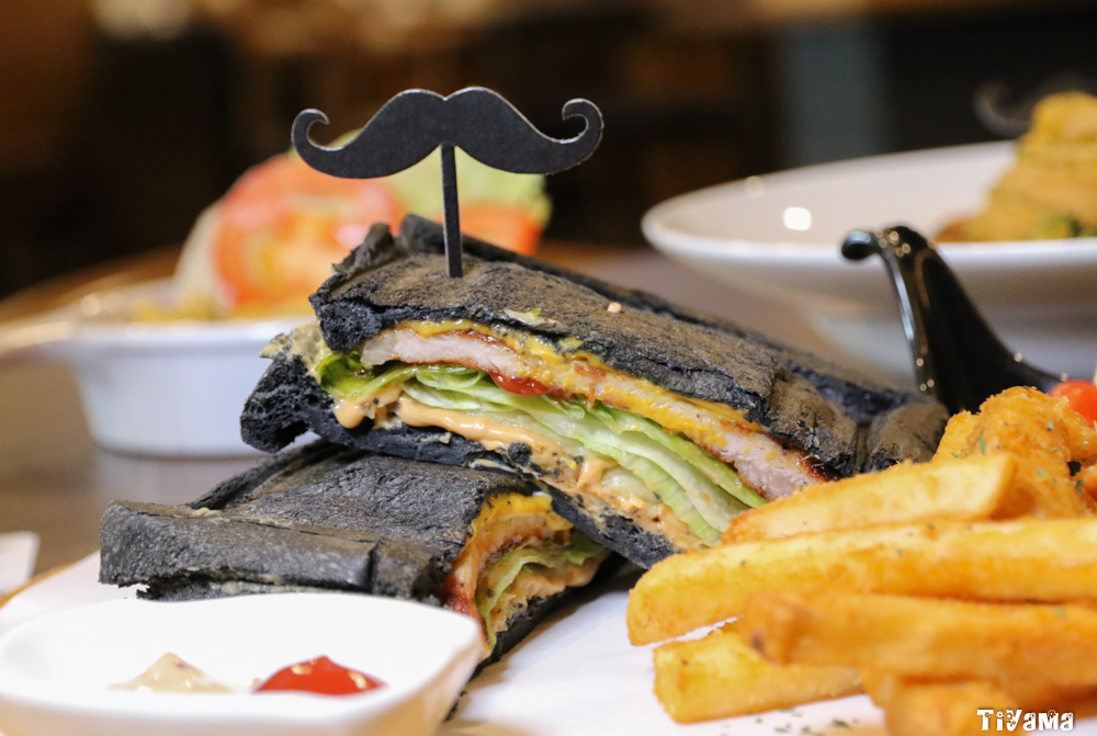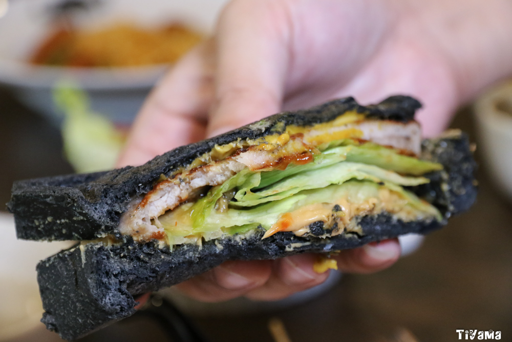 竹炭吐司夾炙燒豬排、起士、生菜、甜洋蔥、特製花生醬,絕妙的好滋味和多層次的口感,大滿足…