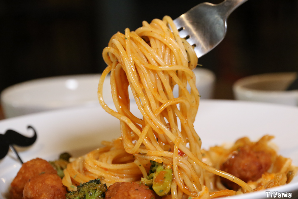 辣度大約比小辣再辣一點,帶點硬度的Q彈義大利麵,緊裹著有層次的辣香,越吃越過癮