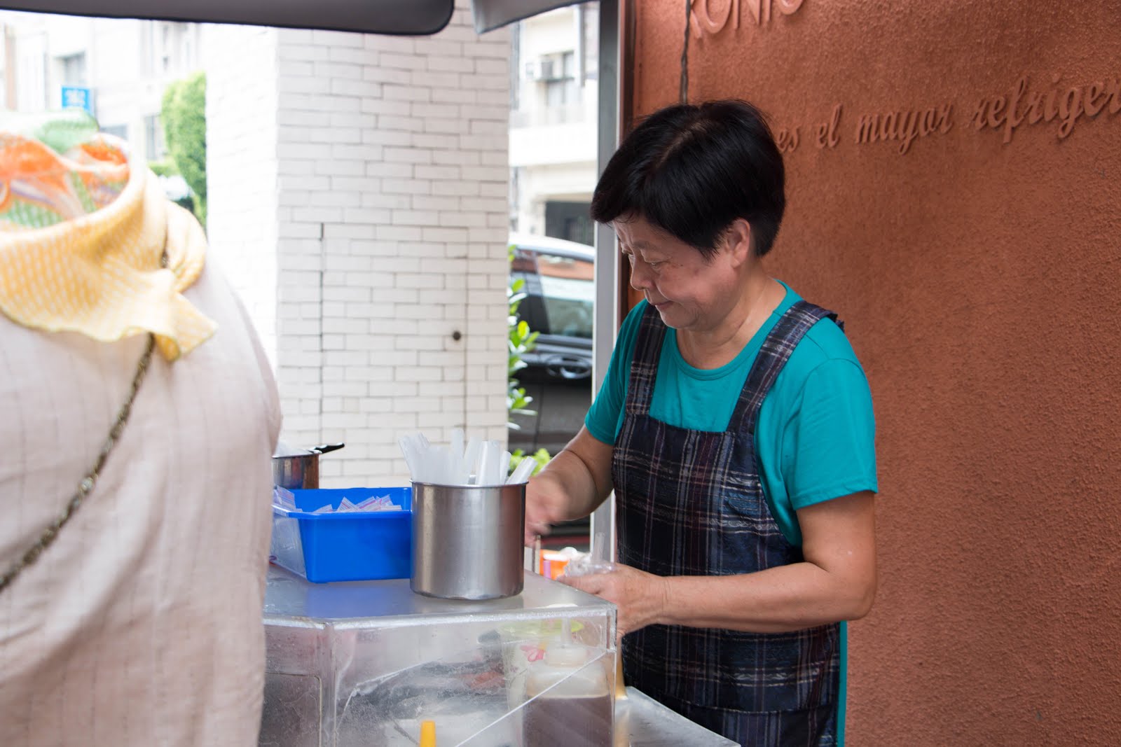 愛玉冰阿姨看起來人很慈祥,穩穩地舀著鐵盆裡的愛玉,沒有忙碌匆匆的感覺,但手腳依然俐落。後方牆上的英文字應該是該店家的設計,卻成為愛玉冰的特殊背景,一點都不違和
