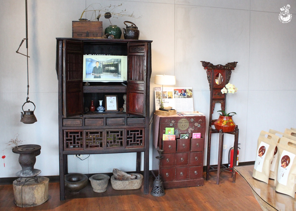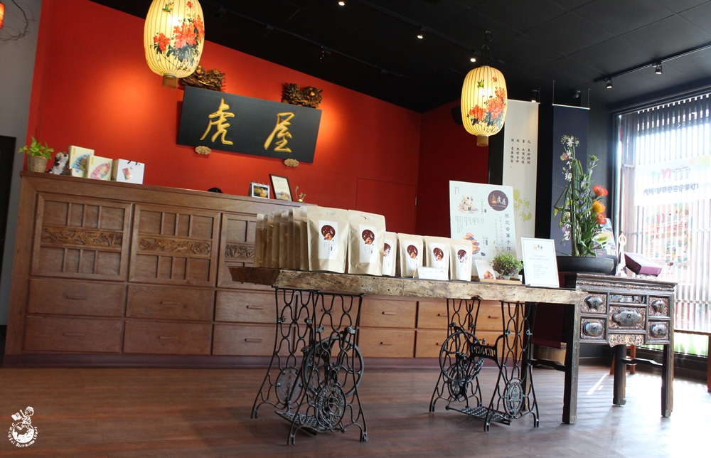 推開虎屋大門後,匾額、燈籠、復古櫃和舊式裁縫機改造的陳列台交織而成濃厚的中國風,形成了外日內中的獨特視覺印象