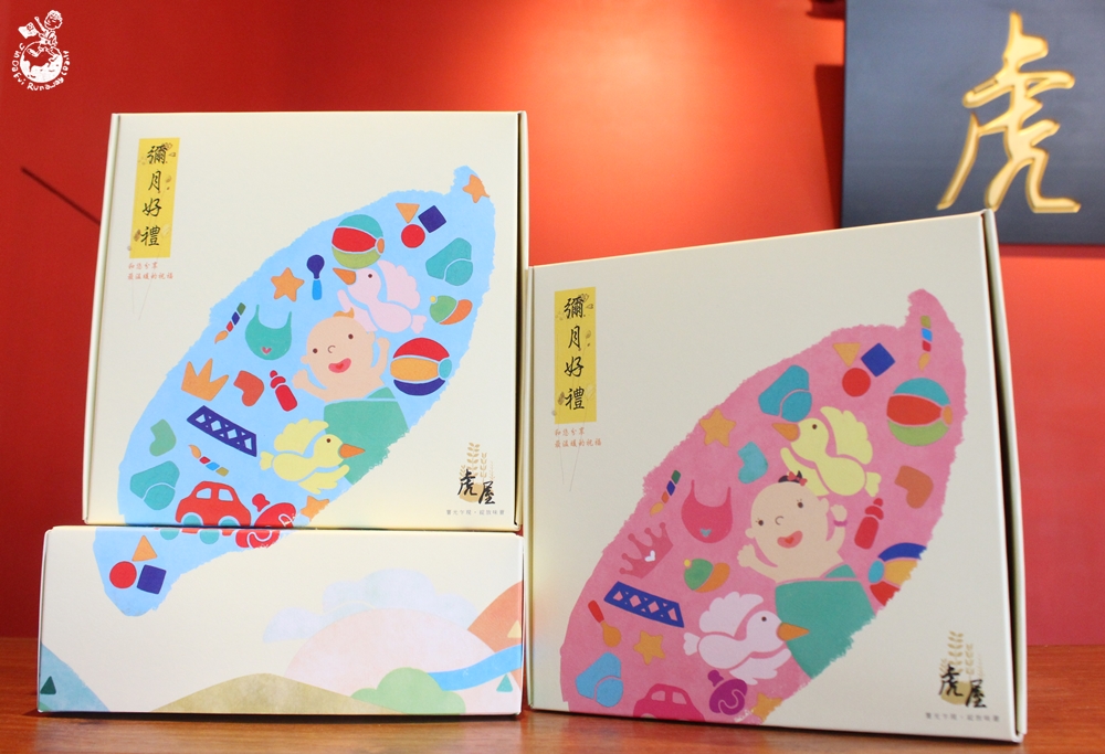 另外,虎屋也有特別設計彌月禮盒,男孩、女孩分別為藍色和粉紅色,圖案是番薯也是台灣,畢竟番薯象徵台灣精神,此用意則代表土生土長的台灣囝仔。