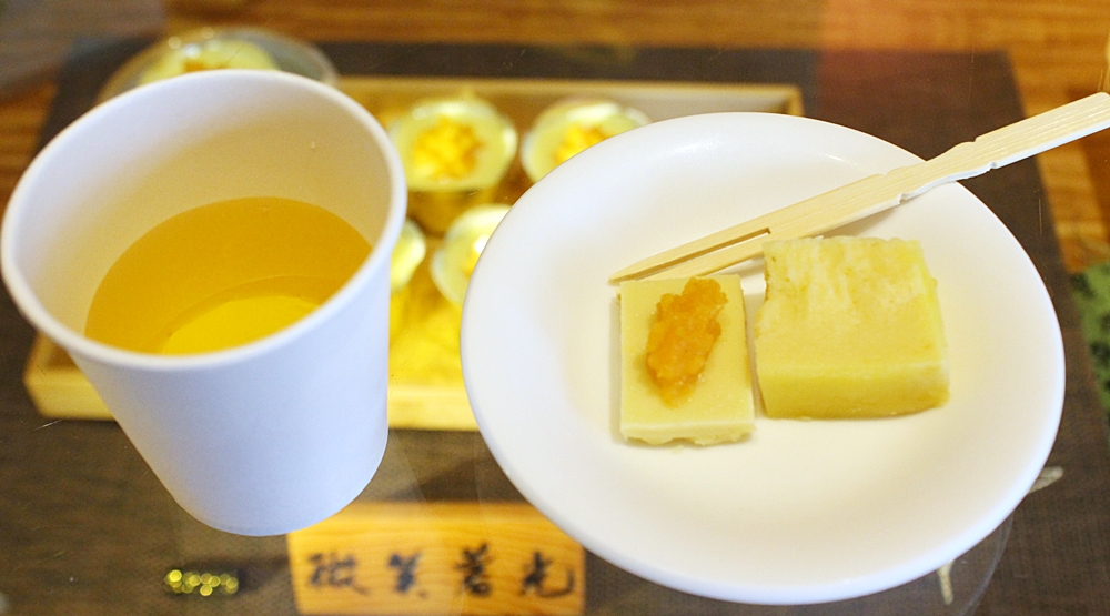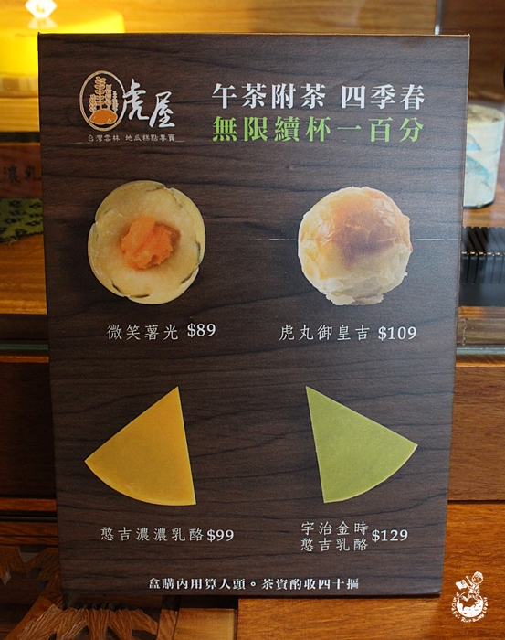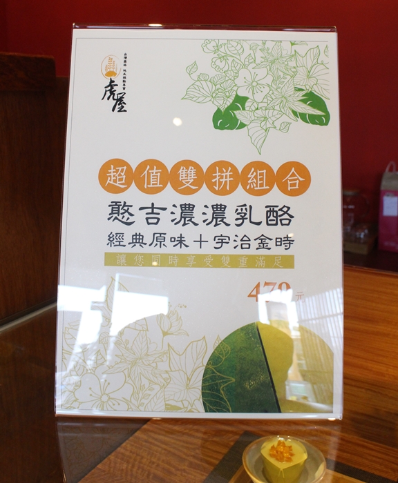 親切的櫃台小姐先是倒了一杯四季春,並且遞上了虎屋紅牌之一的憨吉濃濃乳酪與微笑薯光供客人試吃,品嘗的過程中邊聽她一一講解虎屋的各品項介紹。她特別表示虎屋招待的四季春茶可是和涵碧樓所使用的為同等級,是在暗示走進虎屋就可免費享受和涵碧樓同等級待遇的意思嗎XD