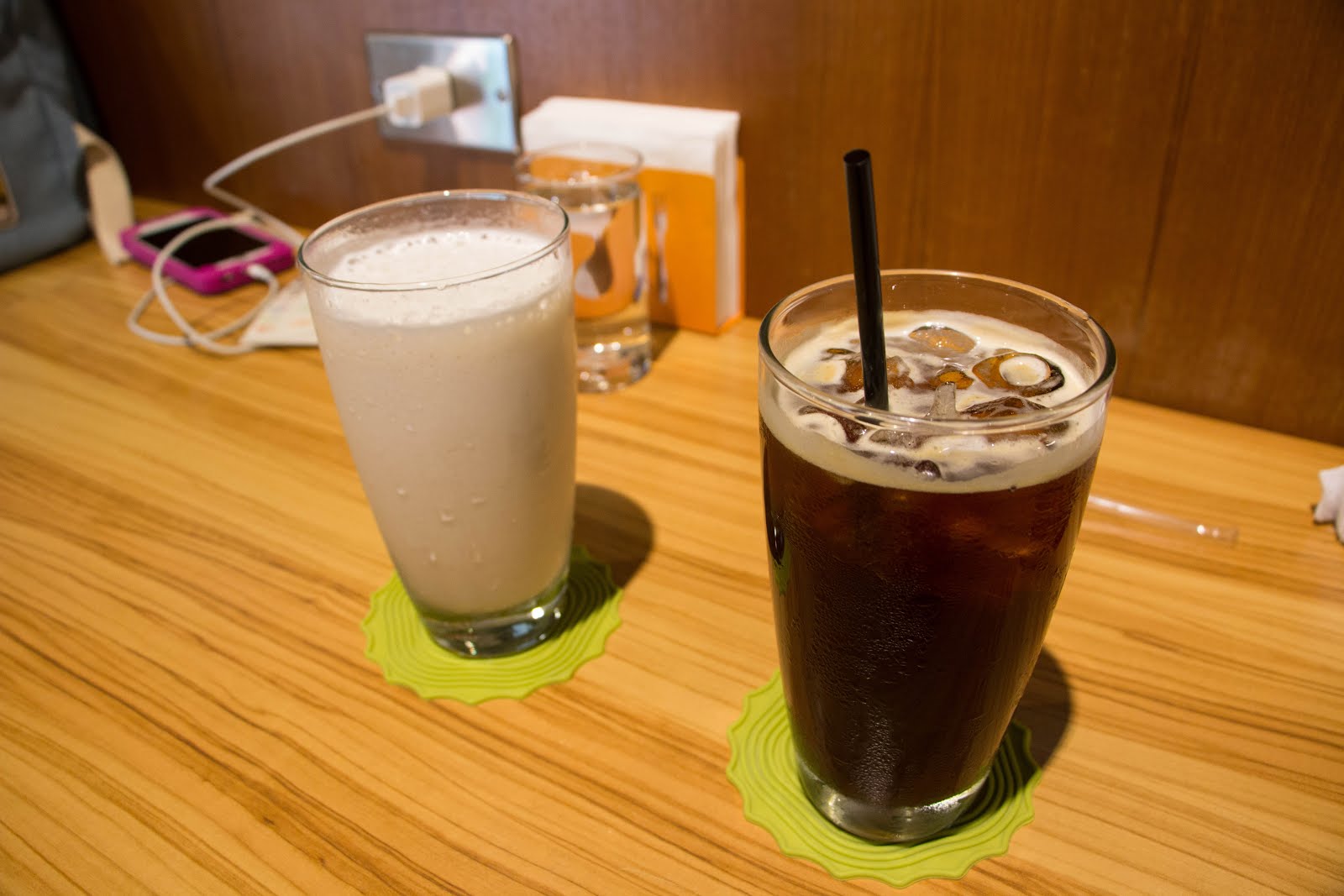 我們分別點了鐵鍋好料的嫩煎豬里肌餐($240)與義式香煎雞腿排($260);飲料部分需額外單點,可以折扣40元,分別點了香蕉牛奶與美式咖啡。