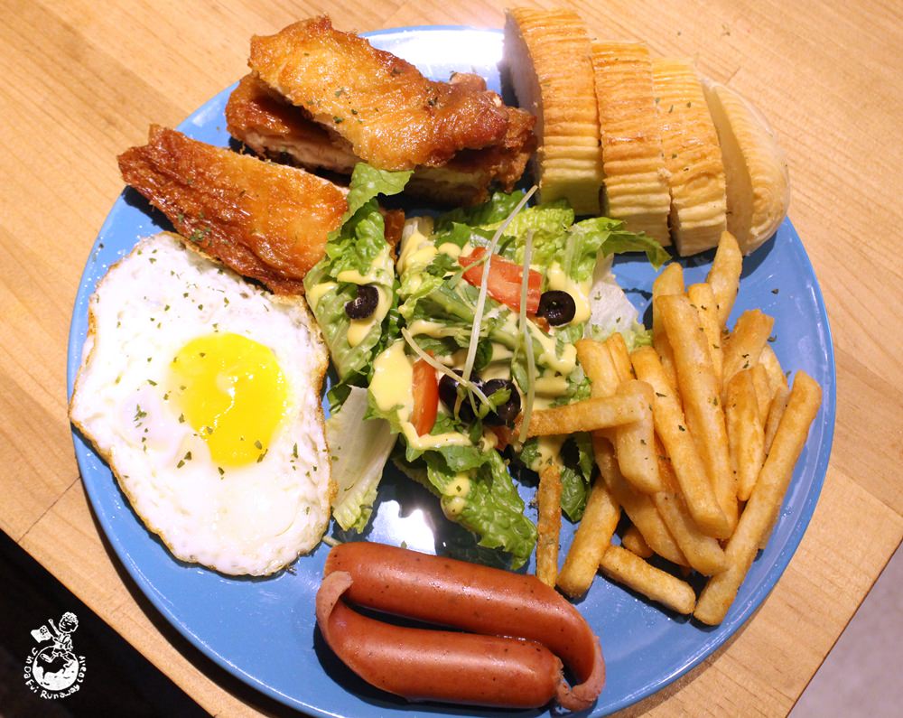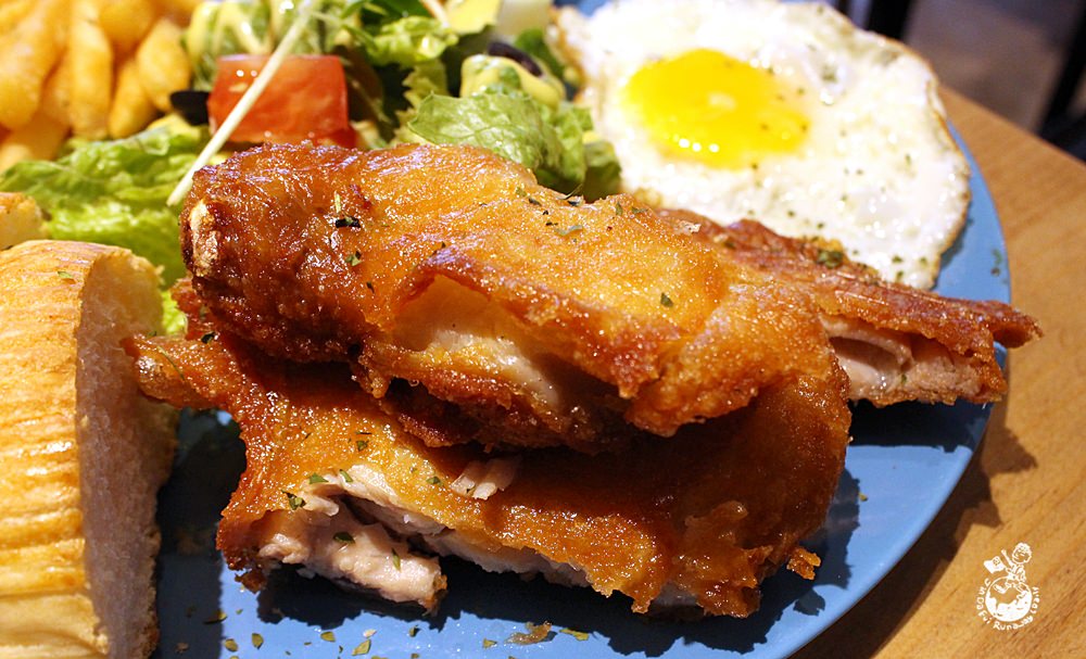 我點了很多人推的招牌雞腿排(加上自己也愛吃雞腿),內含沙拉、麵包、香腸、薯條、太陽蛋和雞腿排,整體餐點份量還滿充足的,吃完一整個飽到翻肚(拍肚皮)