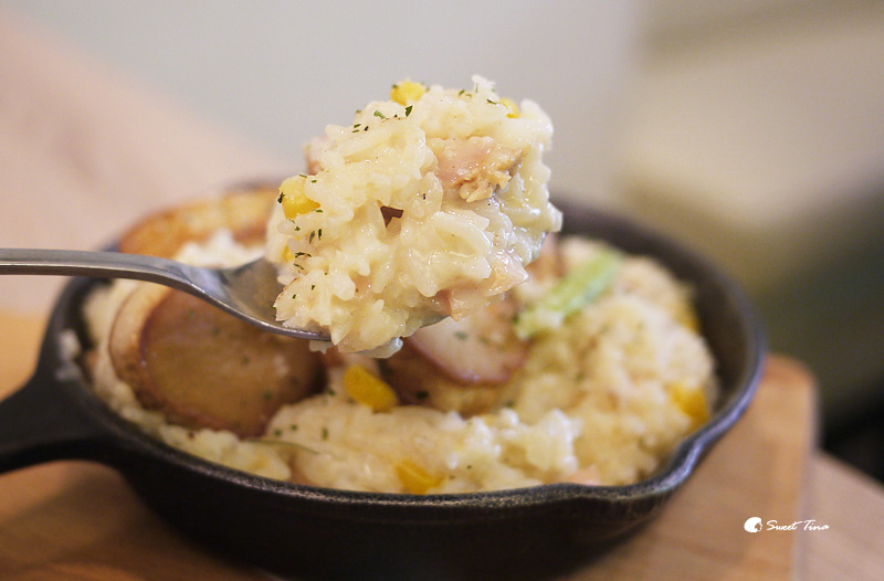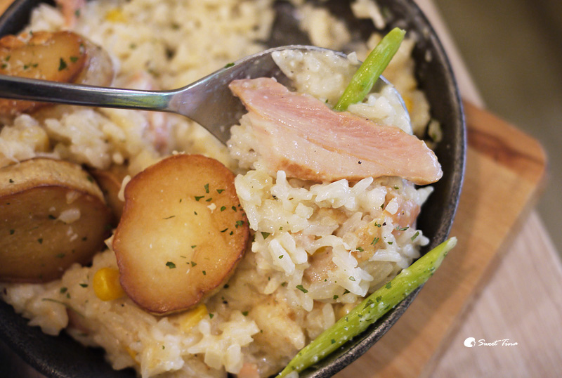 奶油迷迭雞煎菇燉飯 - 除了有大大塊的杏鮑菇,裡頭還有不少雞肉,奶味也不會過重,吃起來還挺剛好的。