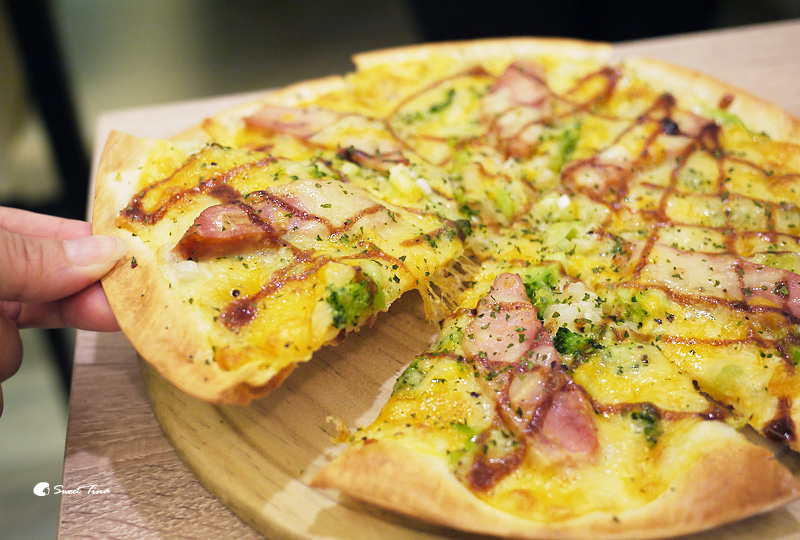 BBQ迷迭雞PIZZA - 皮薄帶點餅乾的清脆感,搭配滿滿的食材及起司,吃起來滿足但又不會膩口,雖然吃完燉飯、義大利麵,但這個PIZZA還是一口接著一口下肚啦,口感上真的還滿棒的。