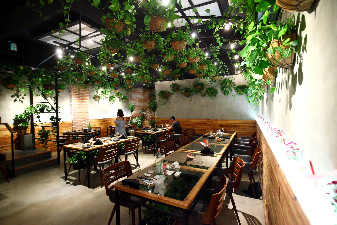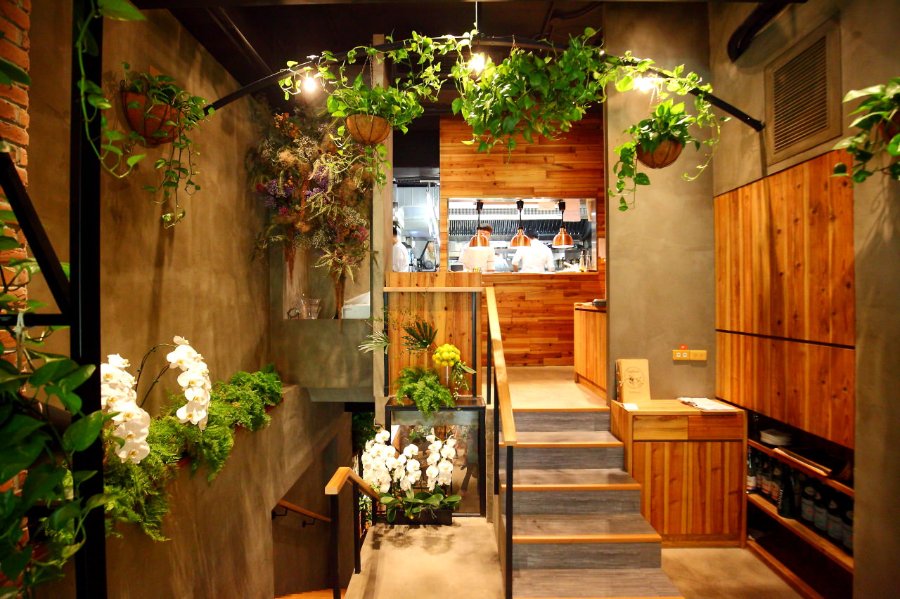 用餐區域是分為1樓和B1,1樓的後方是開放式的廚房,往B1的樓梯旁同樣也是用綠色植物妝點