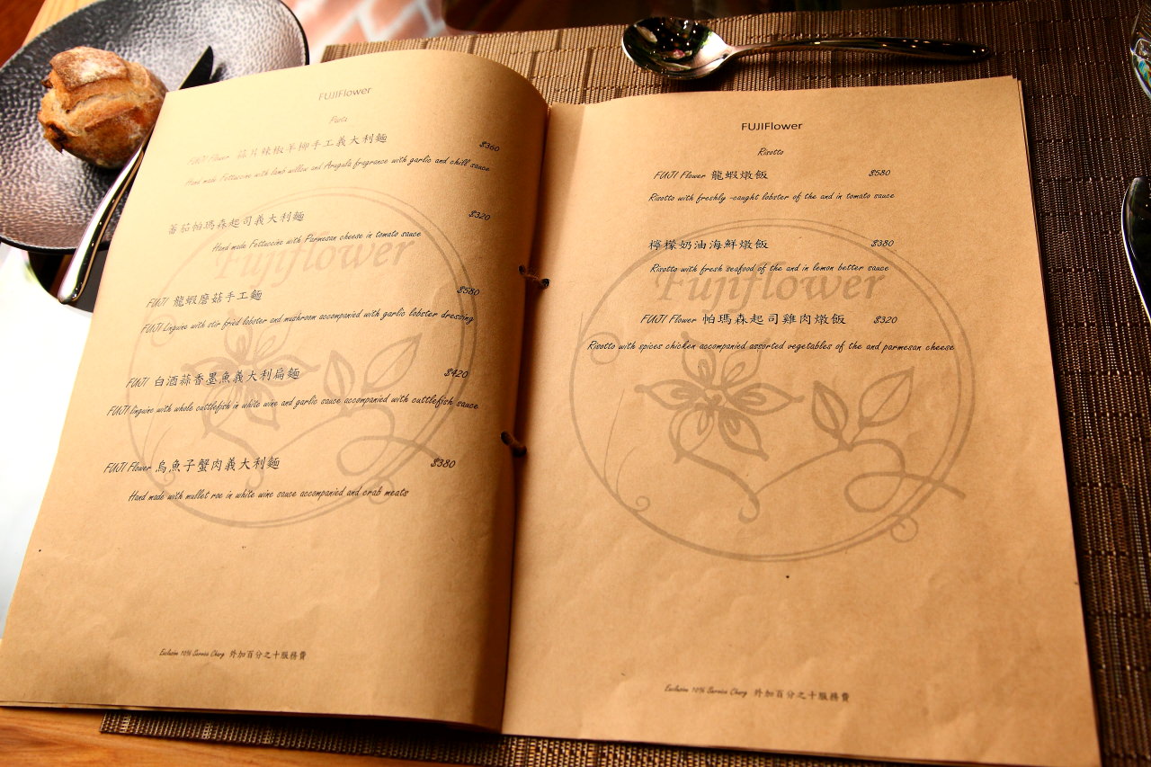 FUJI Flower 義法餐廳-松菸店的菜單,平日中午有商午提供,主要以單點菜色為主,從200~1980元排餐義大利麵等套餐都有提供(點我看完整版菜單)