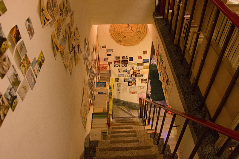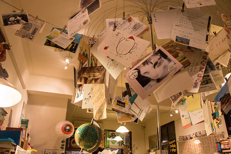 隔壁的空間除了更多的書外,更多了許多明信片的裝飾,懸吊在空中,各形各色都寫著滿滿的字,跟著老舊書本的氣味與瀰散著微溫,帶暖了整個書室。