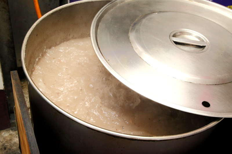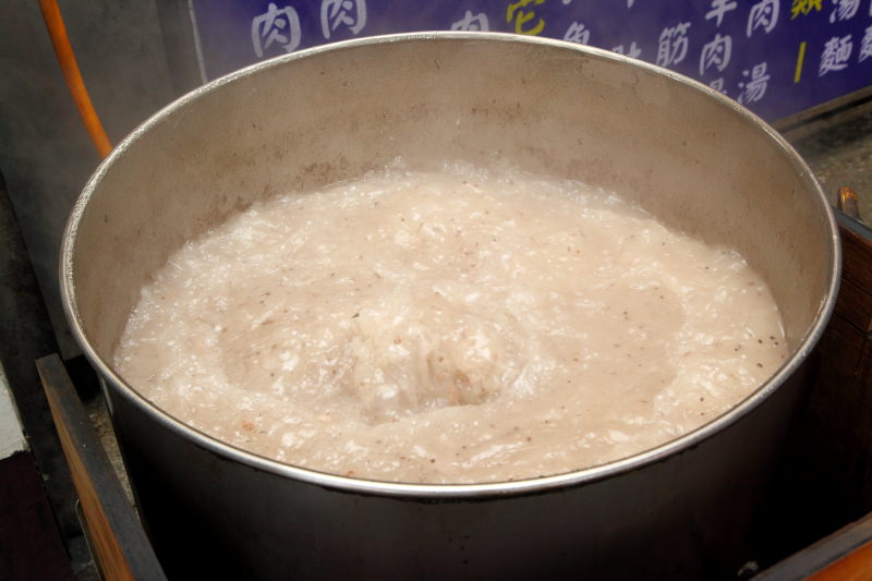 在廚房區前面可以看到一個大鍋子,這正是阿忠牛肉麵的靈魂所在,阿忠牛肉麵的湯頭遵循古法,用牛大骨經過長時間的熬煮而成,類似日式豚骨湯底的做法,用大火不停的沸騰熬煮,將牛大骨的精華徹底融入釋放到湯頭中