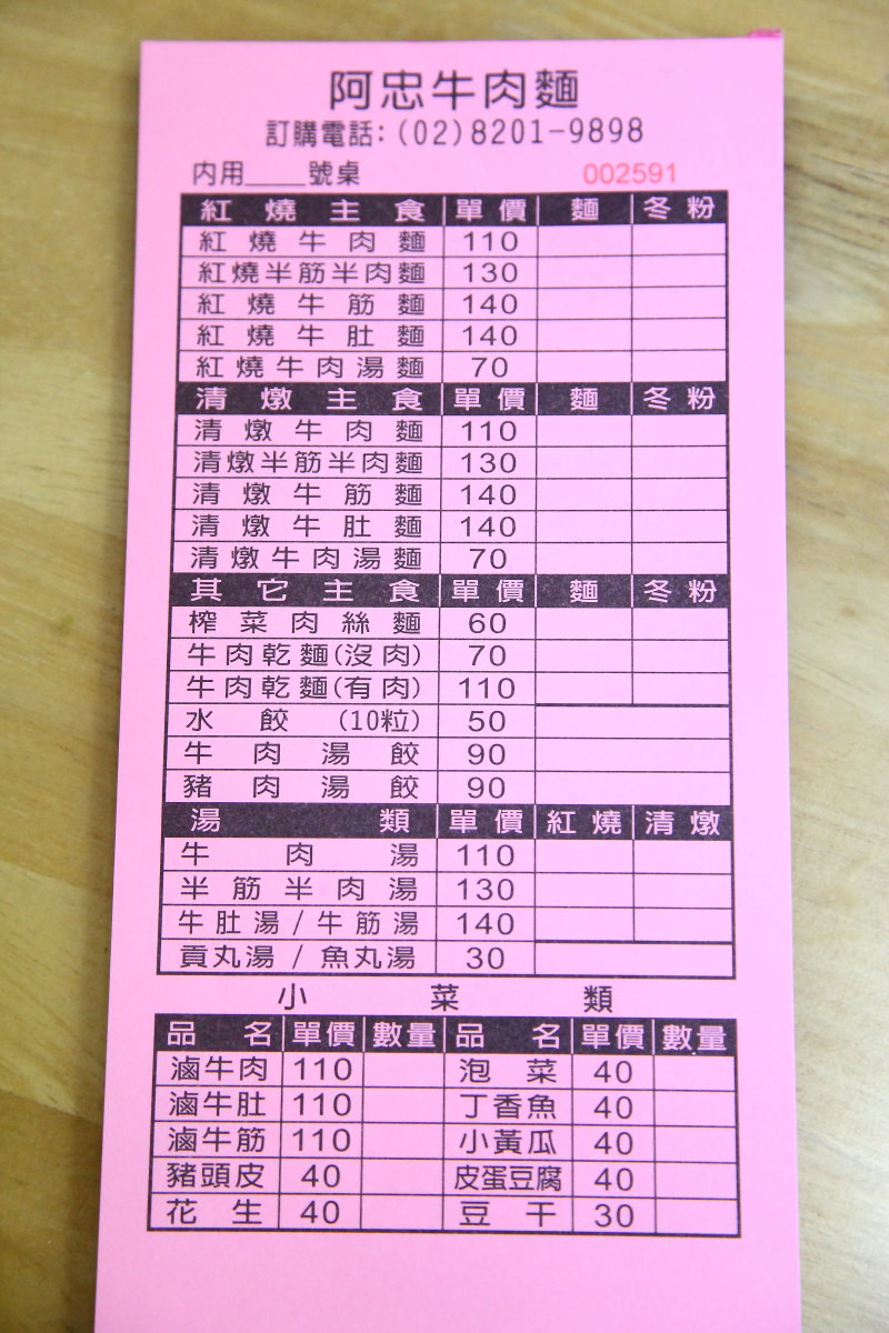 阿忠牛肉麵的菜單,阿忠牛肉麵的價位相當的親民,牛肉麵竟然只要110元!打著燈籠都找不到呀