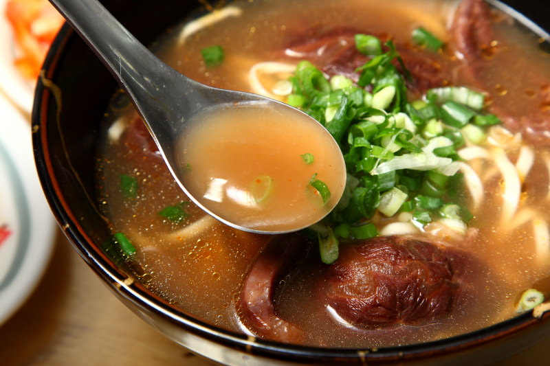 阿忠紅燒牛肉麵的湯頭不似一般紅燒牛肉麵有中藥的味道,純粹只用牛骨湯底為基底,加入辣豆瓣醬等配料拌炒烹煮,喝起來有著牛骨湯天然濃厚的甘甜香味,微微的辣豆瓣紅燒香氣,這紅燒湯底讓人喝上一口忍不住一口接一口停不下來!