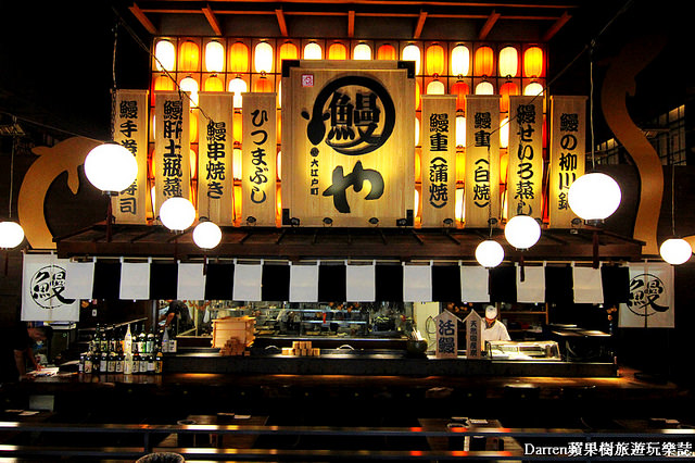 店內重現江戶時代街景就好像在演穿越劇穿越到日本江戶時代,每天現殺頂級青口活鰻使用台灣龍眼炭現烤