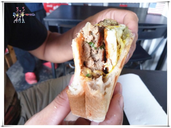 「唔….他的漢堡肉也混好粗ㄟ!有牛肉的香味。」阿寶塞滿嘴的說著。