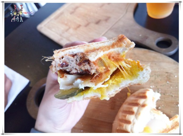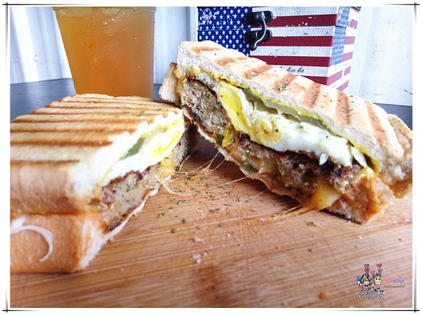 嗯!真的也很好吃,牛肉香味充斥在口中,漢堡肉也算紮實,裡面還有加入一些迷迭香提味,吃完一個也蠻飽了!男生的話會推薦吃這個,應該也可以加麻糬啦!小鳥胃就點切達起司帕尼尼,是說早餐就能吃到這麼好吃的東西很幸福啊!