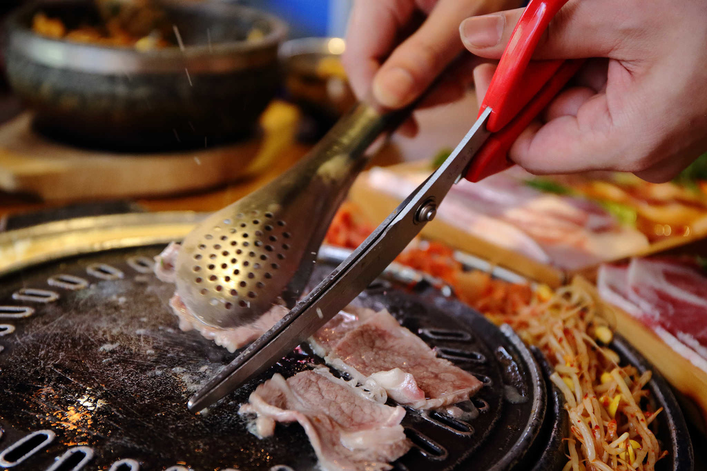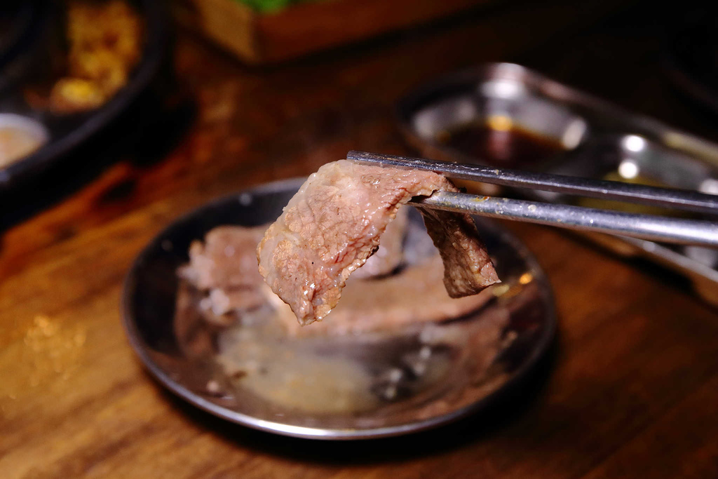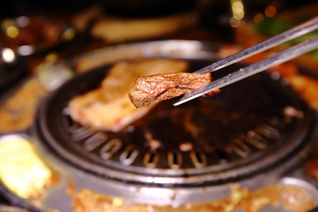 外表烤到焦糖色酥脆,入口彈牙和Q軟肉感完全不油膩,以生菜包著烤好的肉、泡菜品嘗,吃來更爽口!