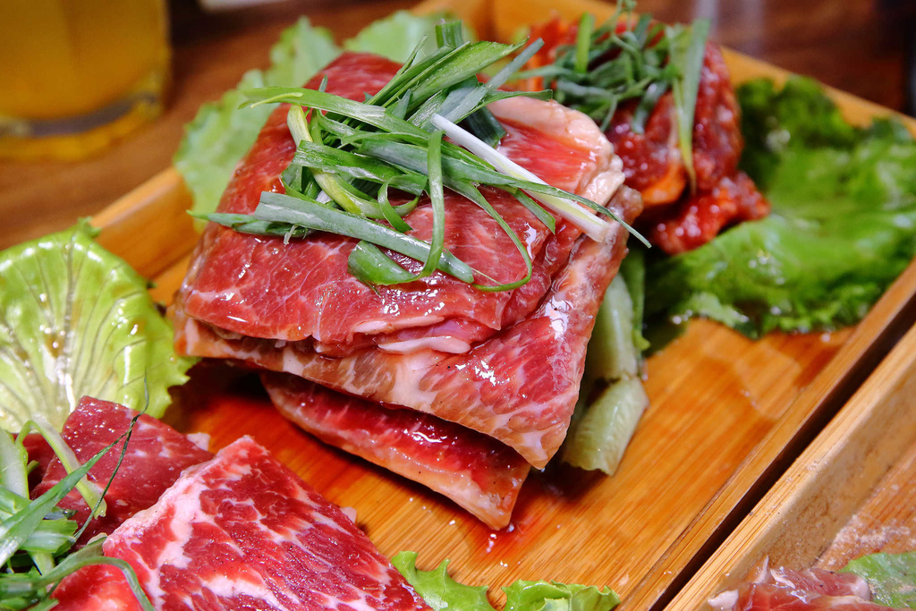 韓式烤肉必附生菜、大蒜和蔥絲,5種韓式小菜(一次性)