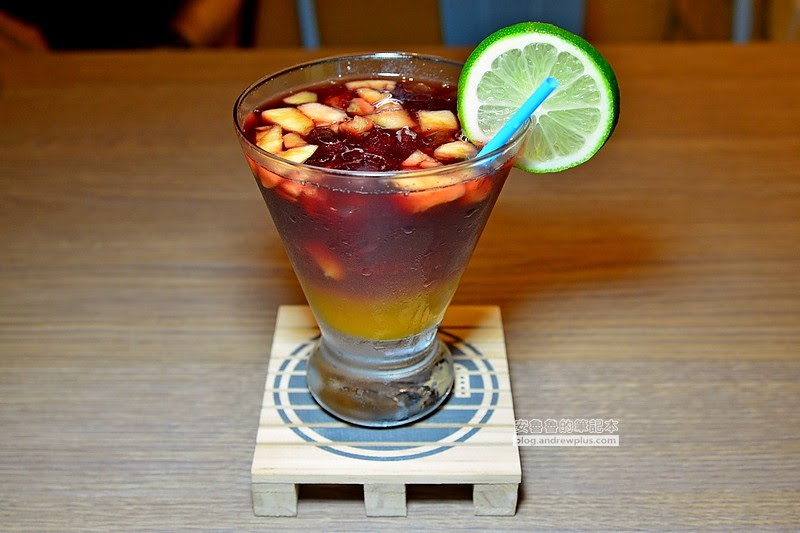 杯子的下層是柳橙汁的黃色,上層是紅酒的紅色,紅黃的漸層;滿滿的蘋果、柳橙切丁和一旁的檸檬切片,搭配藍色吸管,繽紛感十足!