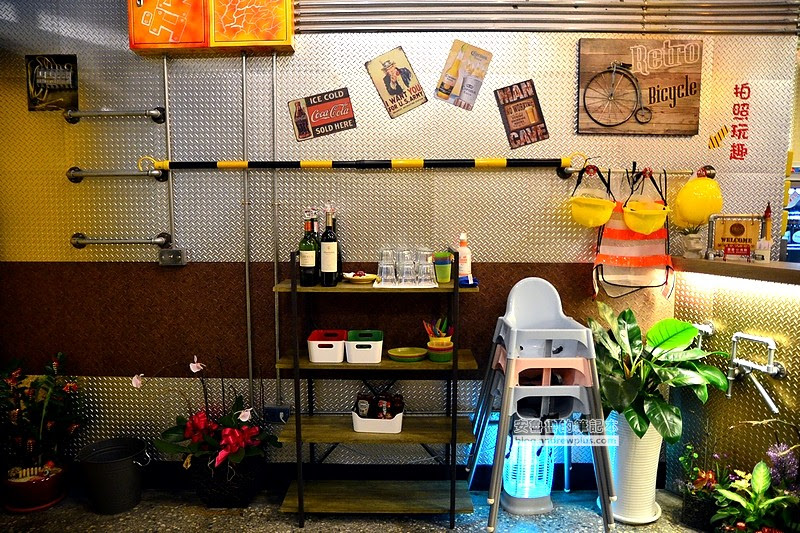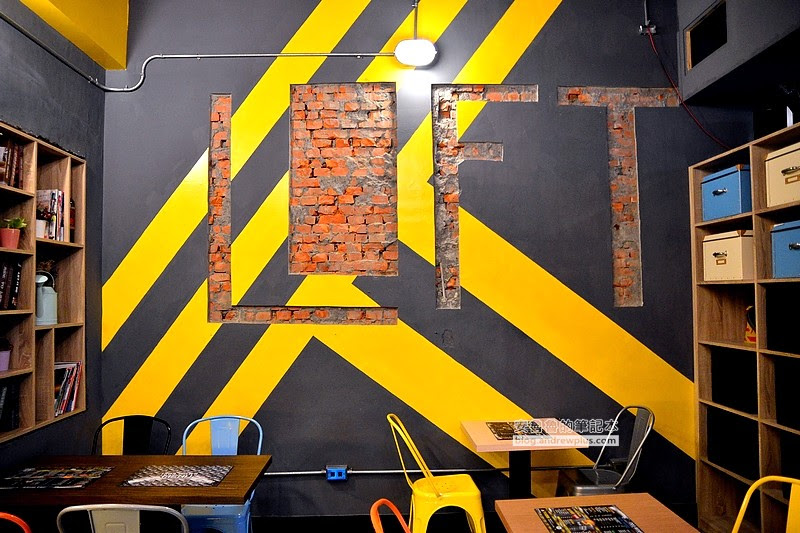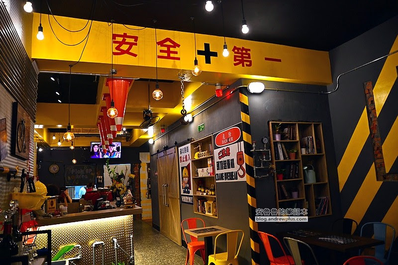 走進店裡面好像走進一間工廠裡面,上頭黃色的橫梁還標注著安全第一!施工的標線、鐵皮的櫃檯、還有吊掛在天花板的三角錐、紅色警示燈~真的工業風的很徹底啊!