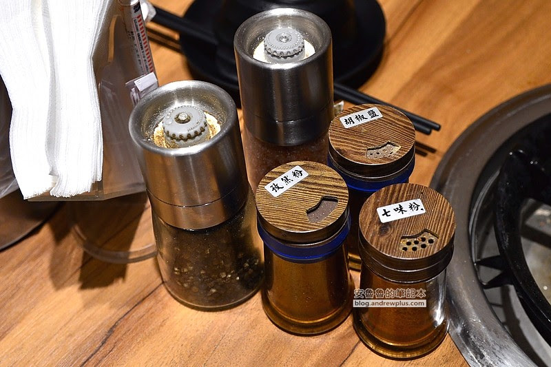 桌面上也備妥了餐巾紙和多種的調味料,像是七味粉、胡椒鹽、孜然粉、黑胡椒粒和玫瑰鹽等