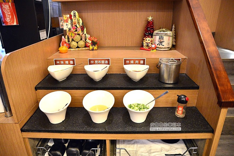 一二樓都有醬料的自助區,提供了味增醬、昆布醬油和燒肉醬等三種醬料、另外還有大蒜、輕鬆等可自行調配組合,不過安魯魯吃燒肉不太愛沾醬,通常都是沾點鹽吃吃原味,在醬料區的下方則是小碗和醬料碟
