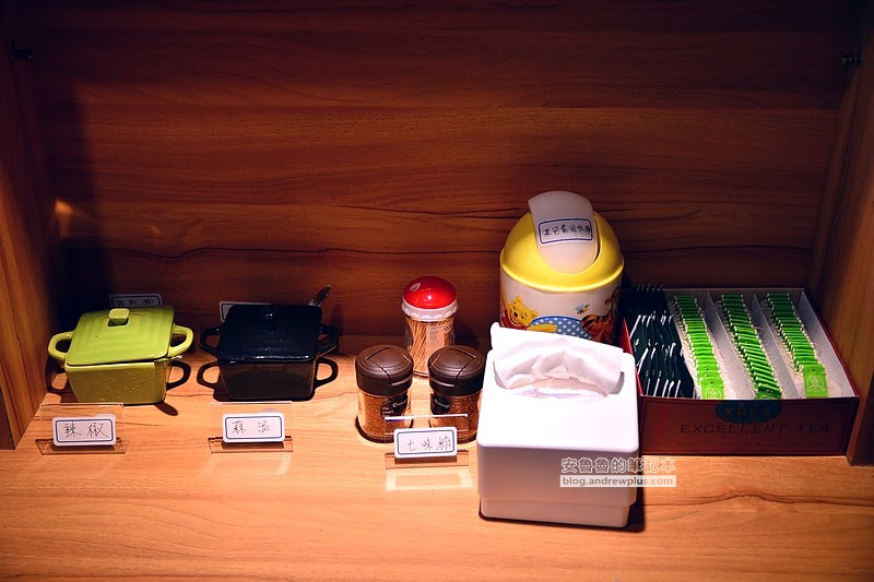 店內是自助服務的,調味料、餐巾紙、茶包都可以在自助區取用