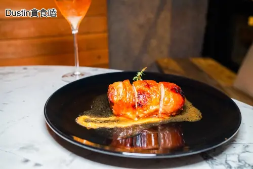 在服務人員的介紹下才知道原來是以低溫烘烤兩小時的豬菲力,上面紅色的則是用切碎的西班牙香腸和百里香等香料調配而成的醬汁,搭配在一起吃起來有著鹹香的口感,讓整道菜又香又嫩,非常好吃!